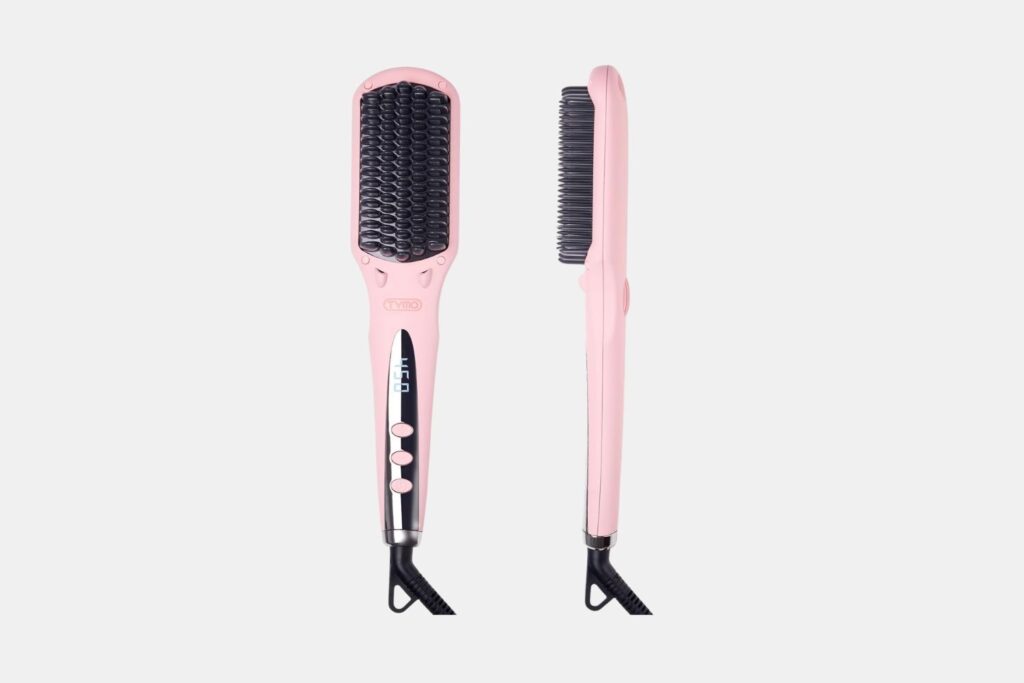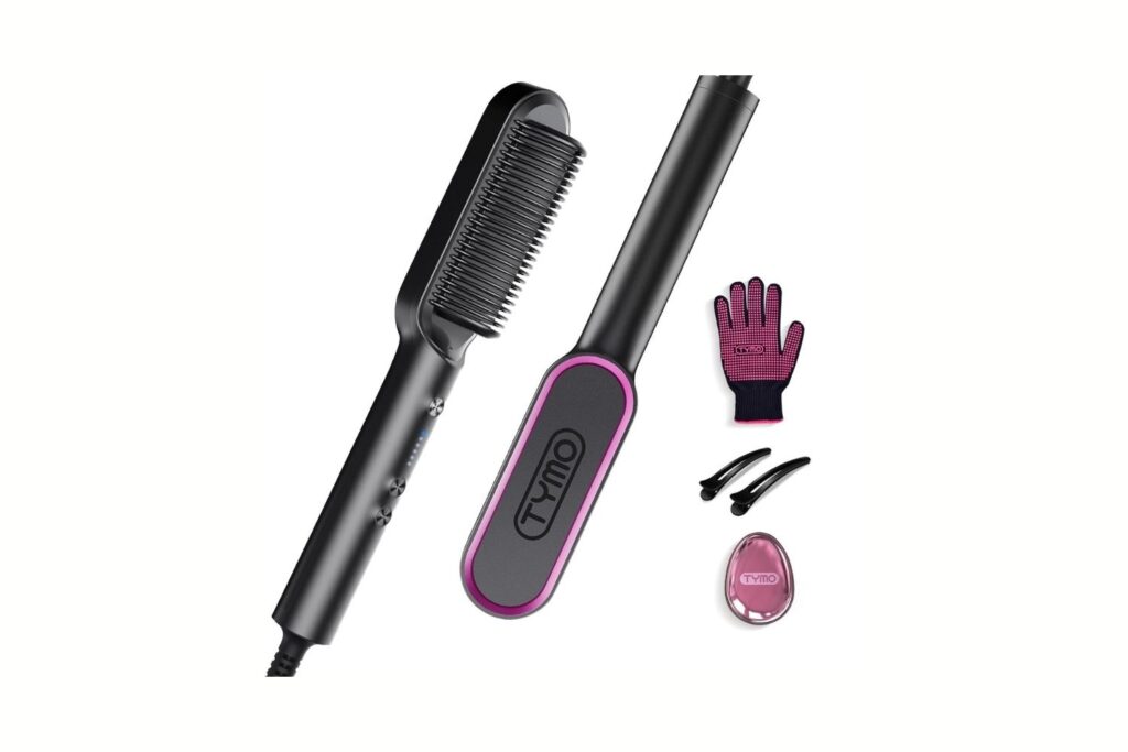 Style faster with the TYMO Ring Hair Straightener Brush – a 2-in-1 hot comb & flat iron with 3D brush teeth, PTC heating, and 5 temps for every hair type. Heats in 20s, anti-scald, auto shut-off, and dual voltage for travel. Includes detangling brush, clips, glove & carrying bag.